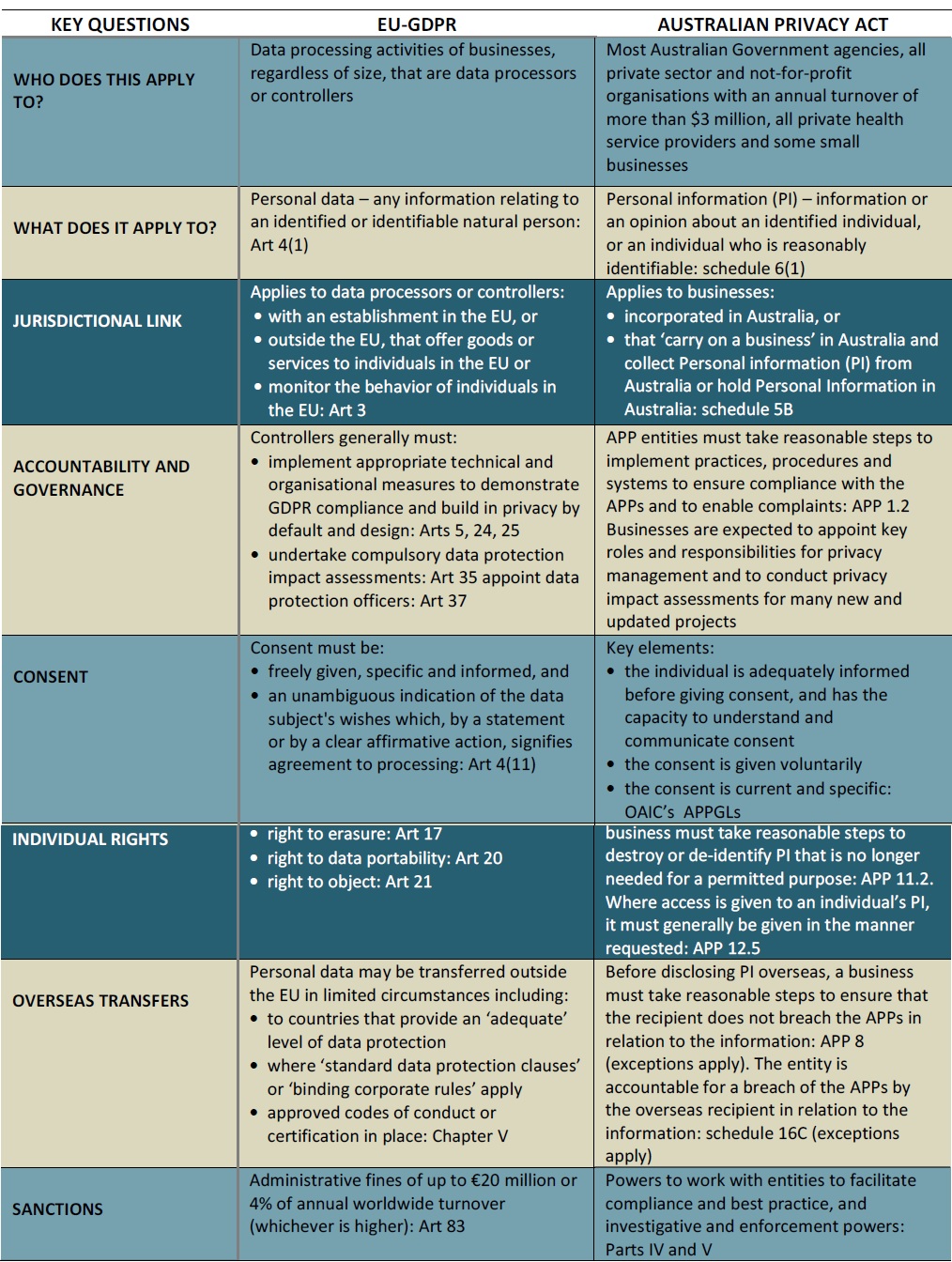 Given the similarities in GDPR and the Privacy Act (particularly The Australian Privacy Principles also called APPs entities) on personal information and data handling, Australian businesses may already have some of the measures in place that will be required under the GDPR. Even so, they should begin taking steps to evaluate their information handling practices and governance structures, seeking legal advice where necessary, to implement the necessary changes before commencement of the GDPR to improve consumer trust through enhanced privacy practices and allow for more consistent internal privacy practices, procedures and systems across the business. The table below compares EU-GDPR versus Australian Privacy Act as per OAIC.